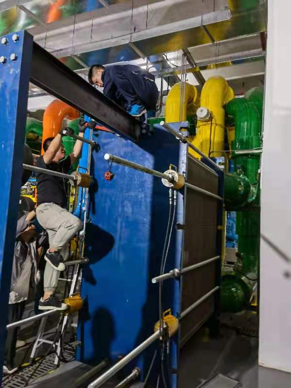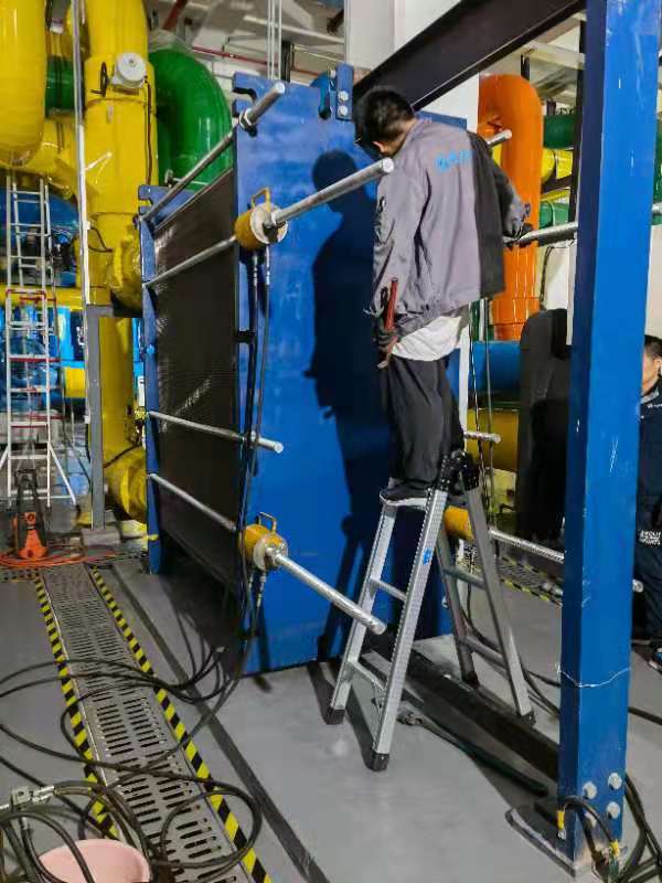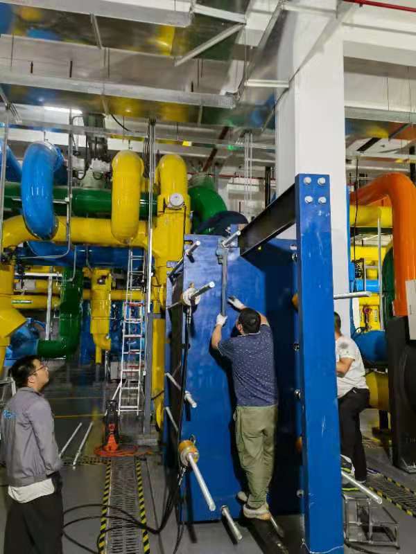 此次,我们为中国移动数据中心清洗维修的可拆板式换热器是进口的Sondex品牌,设计压力1.6Mpa,换热面积为单台876㎡,设备总重8吨,是一个非常耗时的工程,不是一时半会儿就能完成的。但是,中国移动数据中心却非常的着急,因为前期的无效输出,已经严重影响到了整个数据中心的有效运转。所以,这次的清洗维修速度必须加快!