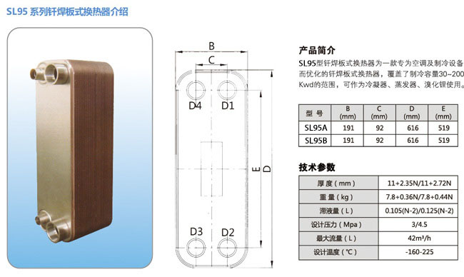 SL95系列钎焊板式换热器介绍: 钎焊板式换热器的密封原理是在波纹管上粘有密封垫,密封垫设计成双道密封结构,并具有型号孔。当介质如从道密封泄露时,可从信号孔泻出。便能及早发现问题加以解决。不会造成介质的混合。 钎焊板式换热器所使用密封垫根据不同的介质和操作温度选用不同的胶种。 SL95钎焊版式换热器尺寸 ![]() ![]() ![]() 钎焊板式换热器应用行业 1.制冷:用作冷凝器和蒸发器。 2.暖通空调:配合锅炉使用的中间换热器、高层建筑中间换热器等。 3.化学工业:纯碱工业,合成氨,酒精发酵,树脂合成冷却等。 4.冶金工业:铝酸盐母液加热或冷却,炼钢工艺冷却等。 5.机械工业:各种淬火液冷却,减速器润滑油冷却等。 6.电力工业:高压变压器油冷却,发电机轴承油冷却等。 7.造纸工业:漂白工艺热回收,加热洗浆液等。 8.纺织工业:粘胶丝碱水溶液冷却,沸腾硝化纤维冷却等。 9.食品工业:果汁灭菌冷却,动植物油加热冷却等。 10.油脂工艺:皂基常压干燥,加热或冷却各种工艺用液。 11.集中供热:热电厂废热区域供暖,加热洗澡用水。 12.其他:石油、医药、船舶、海水淡化、地热利用。 钎焊板式换热器厂家介绍 江阴市速立换热设备有限公司是一家专业生产板式换热器及相关配件的厂家,常年提供板式换热器及板式换热器胶垫批发等业务,公司位于富饶而充满活力的长江经济三角洲明星城市江阴市的霞客镇,北依长江,南临沪宁、锡澄、沿江等高速公路,交通十分便利。是一家专业从事板式换热器新品研制、模具开发、应用设计、生产制造、销售服务的综合性生产型企业。所生产的钎焊式板式换热器与可拆开式板式换热器产品可广泛应用于冶金、食品、轻工、化工、制冷与暖通等领域 。 |