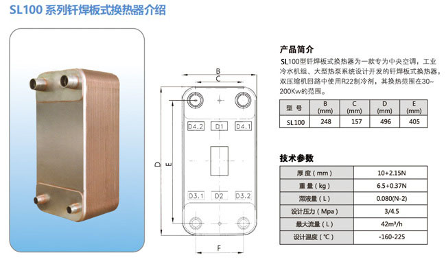 SL100系列钎焊板式换热器介绍 钎焊板式换热器的密封原理是在波纹管上粘有密封垫,密封垫设计成双道密封结构,并具有型号孔。当介质如从道密封泄露时,可从信号孔泻出。便能及早发现问题加以解决。不会造成介质的混合。 钎焊板式换热器所使用密封垫根据不同的介质和操作温度选用不同的胶种。 SL100系列钎焊板式换热器尺寸 ![]() ![]() ![]() 钎焊板式换热器应用行业 1.制冷:用作冷凝器和蒸发器。 2.暖通空调:配合锅炉使用的中间换热器、高层建筑中间换热器等。 3.化学工业:纯碱工业,合成氨,酒精发酵,树脂合成冷却等。 4.冶金工业:铝酸盐母液加热或冷却,炼钢工艺冷却等。 5.机械工业:各种淬火液冷却,减速器润滑油冷却等。 6.电力工业:高压变压器油冷却,发电机轴承油冷却等。 7.造纸工业:漂白工艺热回收,加热洗浆液等。 8.纺织工业:粘胶丝碱水溶液冷却,沸腾硝化纤维冷却等。 9.食品工业:果汁灭菌冷却,动植物油加热冷却等。 10.油脂工艺:皂基常压干燥,加热或冷却各种工艺用液。 11.集中供热:热电厂废热区域供暖,加热洗澡用水。 12.其他:石油、医药、船舶、海水淡化、地热利用。 钎焊板式换热器厂家介绍 江阴市速立换热设备有限公司是一家专业生产板式换热器及相关配件的厂家,常年提供板式换热器及板式换热器胶垫批发等业务,公司位于富饶而充满活力的长江经济三角洲明星城市江阴市的霞客镇,北依长江,南临沪宁、锡澄、沿江等高速公路,交通十分便利。是一家专业从事板式换热器新品研制、模具开发、应用设计、生产制造、销售服务的综合性生产型企业。所生产的钎焊式板式换热器与可拆开式板式换热器产品可广泛应用于冶金、食品、轻工、化工、制冷与暖通等领域 。 |
